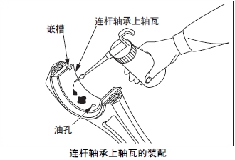 將連桿上軸瓦和連桿大端的嵌槽對準(zhǔn)后插入,軸瓦的內(nèi)表面涂抹潤滑油。這時(shí),要確認(rèn)連桿的油孔和軸瓦的油孔一致。
