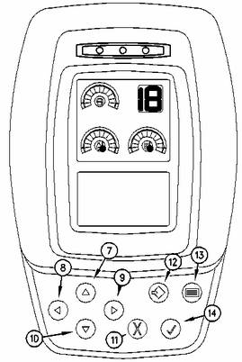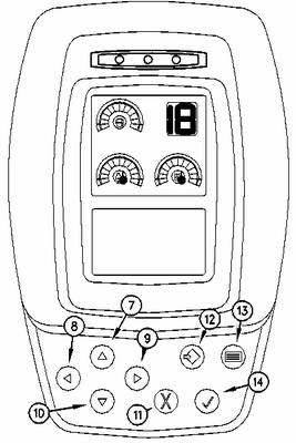卡特彼勒312C, 315C, 318C, 319C, 320C, 321C, 322C, 325C, 330C 和 M325C 挖掘機監(jiān)視器面板 (7) "向上"鍵 (8) "向左"鍵 (9) "向右"鍵 (10) "向下"鍵 (11) "取消"鍵 (12) "設定"鍵 (13) "菜單"鍵 (14) "OK" 鍵 |