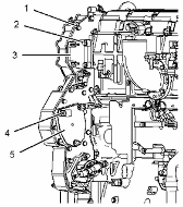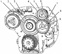 將齒輪組組件 (1) 安置在樞軸上。確保對準(zhǔn)塔齒輪組件與曲軸齒輪上的正時標(biāo)記。