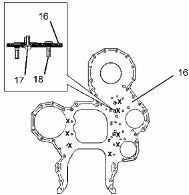 將板 (16) 安裝在缸體的定位銷上。安裝新鎖緊螺栓 (17) (標(biāo)有 "X")以將前板固定在缸體上。擰緊鎖緊螺栓至扭矩為 55 N·m (41 lb ft)。