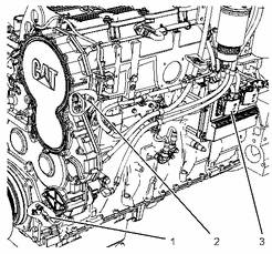 發(fā)動機左視圖(典型示例) (1) 主轉速 / 正時傳感器接頭 (2) 輔助轉速 / 正時傳感器接頭 (3) P2 ECM 接頭 |