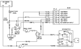 核實已安裝乙醚繼電器。 核實沒有安裝乙醚瓶。 核實鑰匙開關處于 OFF 位置。 在發(fā)動機 ECM P1 接頭的鑰匙開關(P1-70)和乙醚輸出(P1-20)之間連接一條跨接導線。 把鑰匙開關轉到接通位置。 觀察乙醚控制上的柱塞。結果: