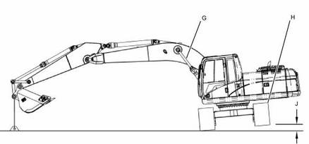 測(cè)量泵壓力時(shí)機(jī)器的位置 (G)動(dòng)臂油缸的伸出部分 (H)后側(cè)或機(jī)器的履帶 (J)履帶與地面之間的空隙 |