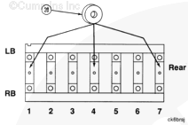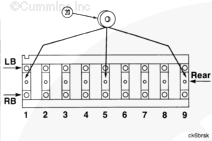 K38 康明斯發(fā)動機上的主軸承蓋編號到“7”,而 K50 康明斯發(fā)動機上則編號到“9”。將每個蓋安裝到正確位置中。“1”號蓋安裝在缸體前部。蓋中的軸承定位舌槽必須位于缸體中的槽的同一側(cè)。 |