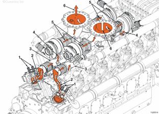 來自缸體主油道的機(jī)油供應(yīng) 機(jī)油供應(yīng)歧管 至左排渦輪增壓器的機(jī)油供應(yīng) 至右排渦輪增壓器的機(jī)油供應(yīng) 渦輪增壓器機(jī)油回油管 排放至油底殼的機(jī)油。