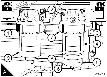 2松開濾罐或沉淀杯(A5)的排放裝置(A8)或(A6)(如果裝配有粗濾器),使水或燃油排出到合適的容器中。