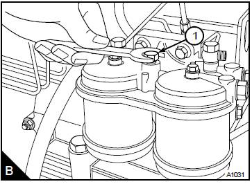 1松開(kāi)粗濾器(A2)的濾清器座上的放氣旋塞。操作燃油輸油泵(B)的注油桿,直到排出從放氣旋塞進(jìn)入燃