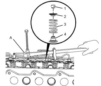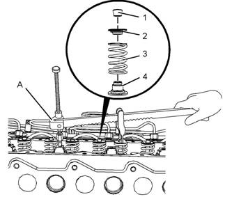 4.將工具(A)安裝在缸蓋的相應(yīng)位置中,以壓縮氣門彈簧(3)。
