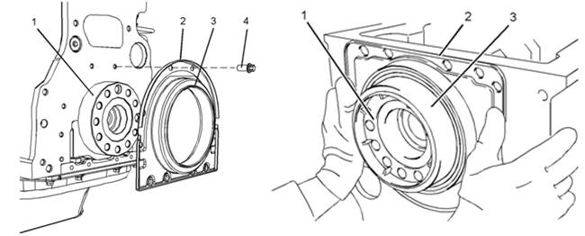 3提供的新曲軸后油封帶有一個(gè)塑料套管(3)。確保安裝時(shí)塑料套管的四個(gè)角在曲軸后油封(2)以內(nèi)。