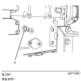 注:確保正時標記(X)與正時標記A6對齊。有關(guān)帶SAE驅(qū)動的空氣壓縮機,請參閱圖289。有關(guān)帶DIN驅(qū)動的空氣壓縮機,請參閱圖290。