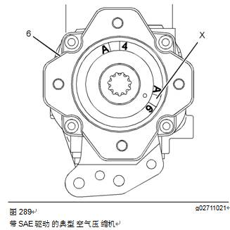 5轉(zhuǎn)動空氣壓縮機的曲軸,使正時標記(X)與空氣壓縮機(6)后表面上的正時標記A6對齊。有關(guān)帶SAE驅(qū)動的空氣壓縮機,請參閱圖289。有關(guān)帶DIN驅(qū)動的空氣壓縮機,請參閱圖290。