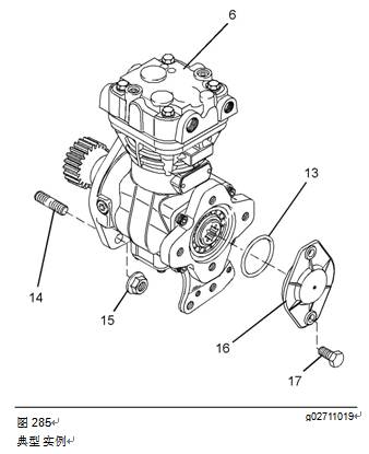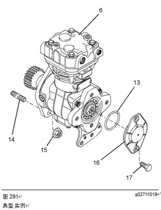 14.如果發(fā)動機在空氣壓縮機后部配備一個液壓泵,安裝該液壓泵。有關(guān)正確的步驟,請參閱OEM信息。