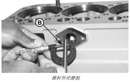 2. 測(cè)量推桿外徑 (B)。如果推桿外徑小于技術(shù)規(guī)格,應(yīng)安裝新推桿。