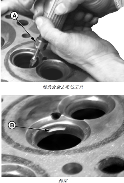 1. 用硬質(zhì)合金去毛邊工具 (A) 提起閥門(mén)座鑲?cè)Φ撞康拿?nbsp;(B)。