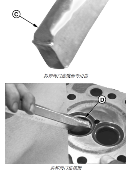 2. 用紙板或棉布保護(hù)缸蓋表面。用錘子敲打用專用圓頭鑿(C) 的手柄,直到閥門(mén)座鑲?cè)?D) 松動(dòng)。