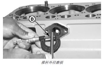 2. 測(cè)量推桿外徑 (B)。如果推桿外徑小于技術(shù)規(guī)格,應(yīng)安裝新推桿。