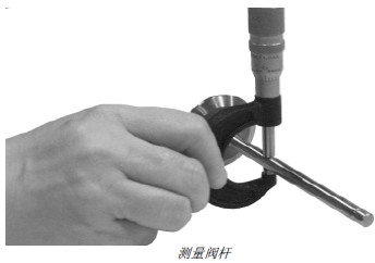 2. 測量閥桿外徑。測量閥桿外徑,記錄測量數(shù)據(jù)并與閥門導(dǎo)管內(nèi)徑相比較。(請參閱本章中的“測量閥門導(dǎo)管內(nèi)徑”部分。)