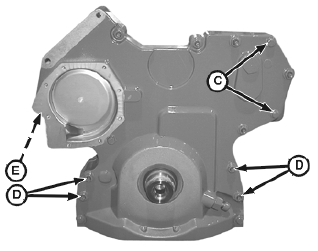 19. 拆卸正時齒輪蓋邊緣的帶帽螺釘 (C) 和John Deere約翰迪爾強(qiáng)鹿柴油發(fā)動機(jī)前板后面的帶帽螺釘 (E)。拆卸正時齒輪蓋。