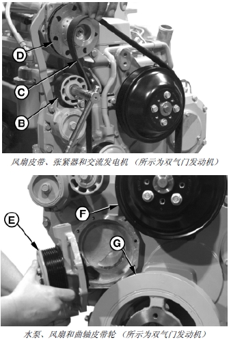 6. 對于四氣門John Deere約翰迪爾強(qiáng)鹿柴油發(fā)動機(jī): 如果需要,整體拆下風(fēng)扇皮帶張緊器和支架。