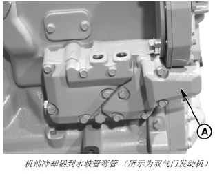4. 拆卸前板上的油冷卻器到水歧管的彎管 (A)。