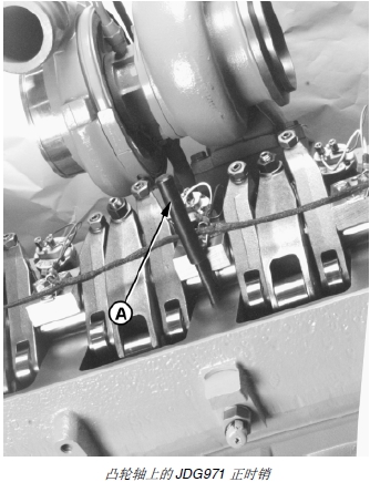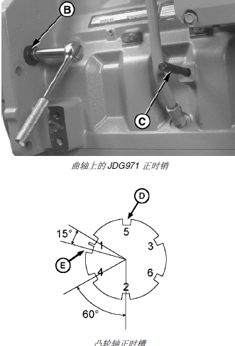 3. 按照運(yùn)轉(zhuǎn)方向(從后面看是逆時針方向)旋轉(zhuǎn)發(fā)動機(jī)飛輪,直到 JDG971 正時銷 (A) 嚙合到凸輪軸的單正時槽 (D)。旋轉(zhuǎn)發(fā)動機(jī)時,從凸輪軸正時銷孔查看凸輪軸正時凸緣,應(yīng)該能夠找到正確的正時槽。如果正時銷裝入正時槽 (D),雙正時槽 (E) 應(yīng)在接近時鐘 11 時的位置(從發(fā)動機(jī)后側(cè)看)。這樣能夠確保發(fā)動機(jī)鎖定在 1 號汽缸壓縮沖程的上止點(diǎn)。一號汽缸上的進(jìn)氣和排氣搖臂應(yīng)松弛。