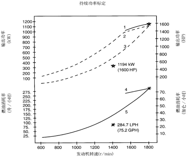 標(biāo)定條件:功率標(biāo)定是基于ISO8665標(biāo)準(zhǔn)規(guī)定的條件:大氣壓力為100kPa (29.612英寸汞柱),環(huán)境溫度為25℃(77°F),相對(duì)濕度為30%。螺旋槳軸功率為按97%扣除齒輪箱損失后的凈功率。燃油消耗是基于使用比重為838.9g/l(7.001磅/加侖),LHV為42780kJ/kW(18390Btu/lb)的35°API燃油。 1. 制動(dòng)功率 kW(HP) 4. 軸功率對(duì)應(yīng)的燃油消耗 2. 扣除齒輪箱損失后的軸功率 kW(HP) 5. 螺旋槳推進(jìn)曲線對(duì)應(yīng)的燃油消耗 3. 螺旋槳推進(jìn)曲線 持續(xù)功率:這種功率標(biāo)定的康明斯發(fā)動(dòng)機(jī)允許在全負(fù)荷工況下連續(xù)不斷地使用。這種功率為ISO3046標(biāo)準(zhǔn)功率 * 對(duì)非LTA康明斯發(fā)動(dòng)機(jī),其燃油耗高1-3%。 | ||||||