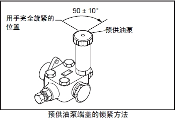(3) 從放氣塞內(nèi)排出的燃油不含有氣泡時旋緊塞頭,但在旋緊最后的1個放氣塞前,先將預供油油泵的端蓋壓下向右旋回至原狀鎖定。