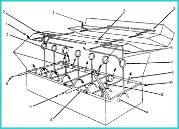 1. 去搖臂軸的油道 2. 堵信住的油道 3. 堵頭 4. 去高壓油泵的油道 5. 搖臂軸 6. 去氣門挺柱的油道 7. 凸輪軸軸承孔 8. 去渦輪增壓器的油道 9. 活塞冷卻噴嘴 10. 去正時(shí)齒輪殼體的油道 11. 缸體主油道的供油管 12. 去前惰齒輪的油道 13. 缸體中的主油道 14. 主軸承孔