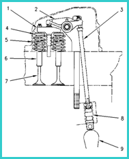 1. 氣門過橋 2. 搖臂 3. 推桿 4. 氣門彈簧旋轉(zhuǎn)壓盤 5. 氣門彈簧 6. 氣門導(dǎo)管 7. 氣門 8. 氣門挺柱 9. 凸輪軸
