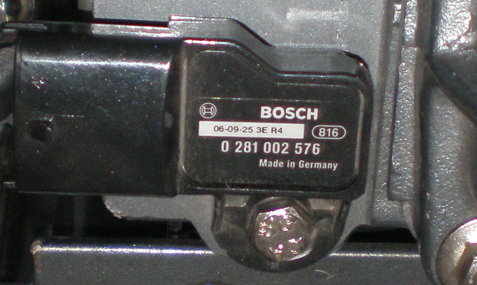 進(jìn)氣壓力溫度傳感器向ECU提供發(fā)動(dòng)機(jī)中冷后的進(jìn)氣溫度和進(jìn)氣壓力信息。壓力敏感原件為硅膜片式,溫度敏感元件為負(fù)溫度系數(shù)的熱敏電阻式。