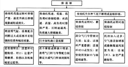 主要特征是,低溫排煙嚴重,溫度升高后排煙減輕或消失;中小負荷排煙輕微,大負荷高速時排煙嚴重;各種轉(zhuǎn)速工況下斷續(xù)或連續(xù)排煙(參見“排藍煙”框圖)。