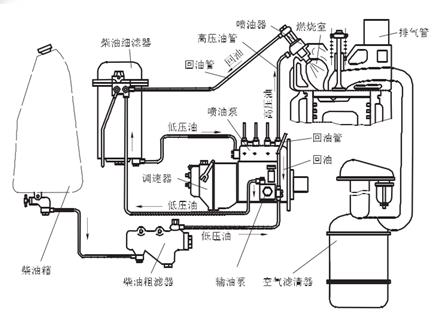 ①燃油供給裝置:由柴油箱、輸油泵、低壓油管、柴油濾清器、噴油泵(包括調(diào)速器)、高壓油管、噴油器、回油管組成。