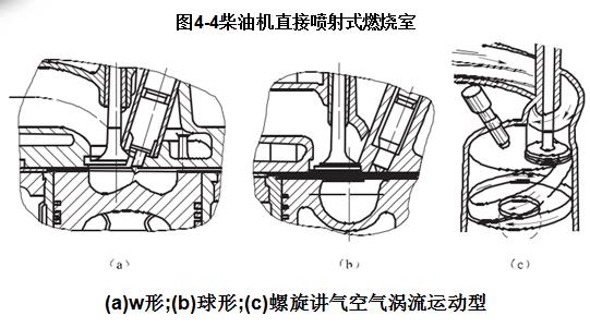直接噴射式燃燒室常見(jiàn)的結(jié)構(gòu)形式(如圖4 -4所示)是由凹形活塞頂與汽缸蓋底面所包圍的空間組成,也稱(chēng)統(tǒng)一式燃燒室。幾乎全部燃燒室容積都在活塞頂面上,按活塞頂面形狀不同,又可分為ω形、球形等。
