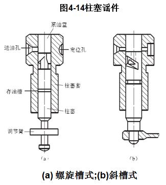 柱塞偶件是產(chǎn)生高壓油的壓油元件,其結(jié)構(gòu)如圖4-14所示。柱塞套裝在泵體座孔內(nèi)固定不動(dòng),柱塞由凸輪驅(qū)動(dòng),在柱塞套內(nèi)上下往復(fù)運(yùn)動(dòng)。此外,可繞自身軸線在一定角度轉(zhuǎn)動(dòng)。柱塞頭部的圓柱表面銑有螺旋槽或斜槽,并利用直槽或中心孔(徑向孔和軸向孔)使槽與柱塞上方泵腔相通。柱塞套上部開有一個(gè)進(jìn)油和回油用的徑向小孔與泵體上的低壓油腔相通,有的則開有兩個(gè)徑向小孔,兩個(gè)小孔的中心線可以在一個(gè)水平線上,也可不在同一水平線上,上面的為進(jìn)油孔,下面的為回油孔。柱塞彈簧通過(guò)彈簧座將柱塞推向下方,使柱塞下端與滾輪式挺桿接觸,并使挺桿中的滾輪與下凸輪接觸。