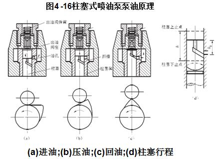 柱塞繼續(xù)上移,當(dāng)柱塞上的斜槽與油孔開始接通時(shí),泵腔內(nèi)的燃油便經(jīng)柱塞上的直槽、斜槽和油孔流向低壓油腔。這時(shí),泵腔中油壓迅速下降,出油閥在彈簧壓力作用下立即復(fù)位,噴油泵供油立即停止。此后柱塞仍繼續(xù)上行,直到上止點(diǎn)為止,但不再泵油(如圖4-16 (c)所示)。