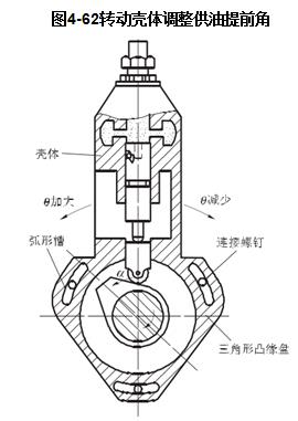 如圖4-62所示,泵體前端是三角形凸緣盤,其上開有三條弧形槽,用螺栓將其固定在驅(qū)動(dòng)齒輪后面的箱體上。調(diào)整時(shí),松開螺釘,轉(zhuǎn)動(dòng)殼體,根據(jù)凸輪軸的驅(qū)動(dòng)方向,逆凸輪軸轉(zhuǎn)向轉(zhuǎn)動(dòng)殼體時(shí),供油提前角變大;反之則減小。