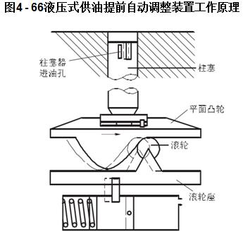 在噴油泵處于靜止?fàn)顟B(tài)時(shí),活塞在彈簧力作用下,被推向右側(cè)。當(dāng)柴油機(jī)工作后,泵內(nèi)燃油壓力升高。當(dāng)活塞兩邊失去平衡時(shí),活塞開始向左移動(dòng),通過連接銷、撥銷推動(dòng)滾輪座沿順時(shí)針方向轉(zhuǎn)動(dòng),即滾輪座相對于平面凸輪轉(zhuǎn)動(dòng),迫使平面凸輪提早頂起,供油提前角增大而使供油提前;反之,轉(zhuǎn)速降低,滾輪逆時(shí)針方向轉(zhuǎn)動(dòng),即滾輪座順著平面凸輪轉(zhuǎn)動(dòng),供油提前角減小而使供油滯后,如圖4-66所示。