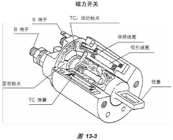 圖 13-3所示為磁力起動(dòng)馬達(dá)電磁閥。磁力開關(guān)有下列主要功用:•吸引柱塞來推出小齒輪,使其與洋馬發(fā)動(dòng)機(jī)齒圈嚙合。•閉合活動(dòng)觸點(diǎn),使蓄電池電流流過電樞。