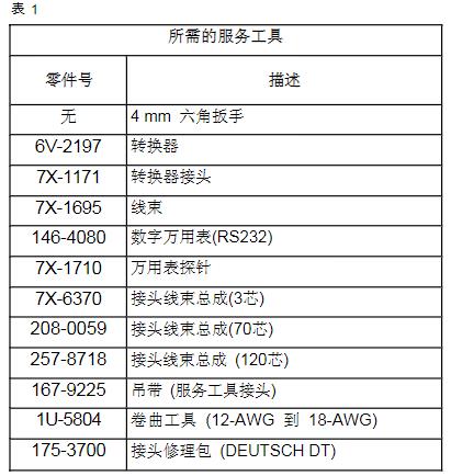 卡特電氣服務工具被設計用來幫助服務工程師完成以下任務:• 獲得信息• 分析系統(tǒng)• 系統(tǒng)校準• 系統(tǒng)設置• 數(shù)據(jù)鏈路通訊所需的服務工具表1列出的工具是服務工程師完成本手冊上的測試程序所需要的。