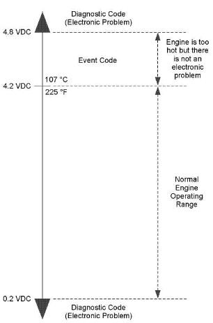 典型模擬溫度傳感器的輸出電壓圖8表示了一個(gè)典型模擬傳感器的信號(hào)范圍。如果傳感器輸出信號(hào)低于0.2 VDC或高于4.8 VDC,就會(huì)生成診斷代碼。 動(dòng)態(tài)診斷代碼激活的診斷代碼代表了電氣控制系統(tǒng)的問題。盡可能快地糾正問題。當(dāng)生成一個(gè)動(dòng)態(tài)診斷代碼時(shí),“ 動(dòng)態(tài)警告” 指示燈(在卡特ET“ 發(fā)動(dòng)機(jī)控制警告狀態(tài)” 上)被激活,以警告操作者。如果生成卡特cat代碼的情況是暫時(shí)的,信息會(huì)從動(dòng)態(tài)診斷代碼清單中消失。診斷代碼變?yōu)槿罩尽?br />