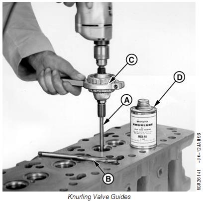 注意:磨損的導(dǎo)軌允許間隙為0.15毫米(0.006英寸),但仍可接受。如果氣門與導(dǎo)軌之間的間隙為0.25 mm(0.010 in.)或更小,磨損的導(dǎo)軌可以滾花,以使其返回到規(guī)定的間隙。如果間隙超過(guò)0.25 mm(0.010 in.),則安裝超大閥門。