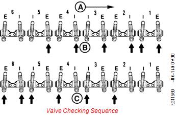 規(guī)格搖臂蓋到托架蓋螺釘扭矩……8牛•米(5.9磅-英尺)閥門檢查順序A-強(qiáng)鹿約翰迪爾柴油發(fā)動機(jī)前部B-編號。1缸“TDC”C-No。6缸“TDC”強(qiáng)鹿約翰迪爾柴油發(fā)動機(jī)D-前部
