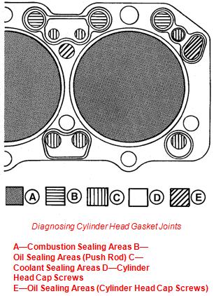 A—Combustion Sealing Areas B—Oil Sealing Areas (Push Rod) C—Coolant Sealing Areas D—Cylinder Head Cap Screws