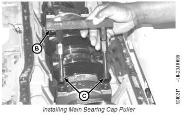 2. Install JDG1069 Puller (B) so that tips (C) of blind hole puller legs are below bearing cap half.