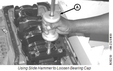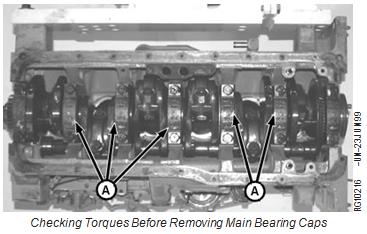 IMPORTANT: Before removing main bearing caps (A), check for proper torque on all main bearings. Also, check each bearing cap to make sure they are numbered for reassembly on the same numbered main bearing bosses. Keep matched main bearings with their respective main bearing cap for comparison with crankshaft journal (surface wear) from which removed.