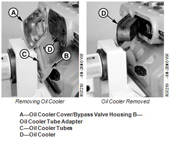 2. Remove two cap screws securing oil cooler tube adapter (B). Remove cover, tubes (C), and adapter as an assembly.