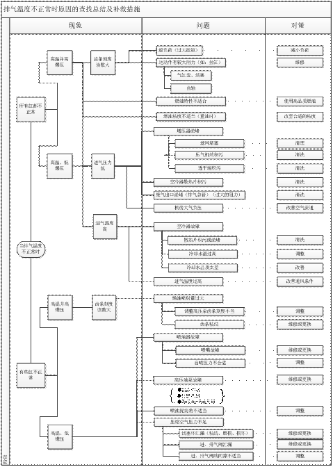 通過以上對(duì)排溫過高的原因分析,首先想到去檢查一下排氣的煙色,發(fā)現(xiàn)冒黑煙的情況并不嚴(yán)重。隨后又檢查了透平壓差、空冷器的溫度(冷卻水溫和空氣溫度)、燃油溫度等參數(shù),除了增壓壓力略低以外其余均在正常范圍之內(nèi),對(duì)能導(dǎo)致排溫過高的原因進(jìn)行逐一的排查。