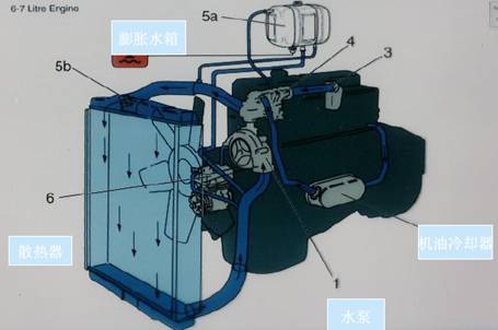• 工程機械發(fā)動機上應用最普遍的是強制循環(huán)式水冷卻系,它由水泵潤滑油冷卻器、變速箱冷卻器、節(jié)溫器、缸蓋、缸體、散熱器進水管、水泵進水口、散熱器、補液箱、風扇等構成。水泵通過水管從散熱器內吸入低溫水,使冷卻水在發(fā)動機缸體和缸蓋的水道中不停地循環(huán)流動,冷卻水吸收熱量后又流回散熱器。風扇使空氣高速流過散熱器,將散熱器中水地熱量散發(fā)到空氣中去。