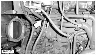 72 僅適用于 D13B-A/C/G/H/K/L,D13C2-A,D13C4-A(雙渦輪增壓器)安裝將隔熱罩固定到歧管上的兩個螺栓和墊片(1)。不要完全緊固螺栓。安裝將隔熱罩側(cè)面固定到其下部的螺栓。用中心螺栓夾緊輸油軟管(2)。不要完全緊固螺栓。