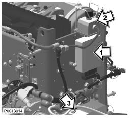 79 僅適用于 D13B-C/D/E/F/L/M/N安裝電源模塊(1)和緊急停車開關(guān)(2)。連接電源模塊線束端子、急停車開關(guān)和飛輪傳感器(3)。用夾子固定導(dǎo)線線束。